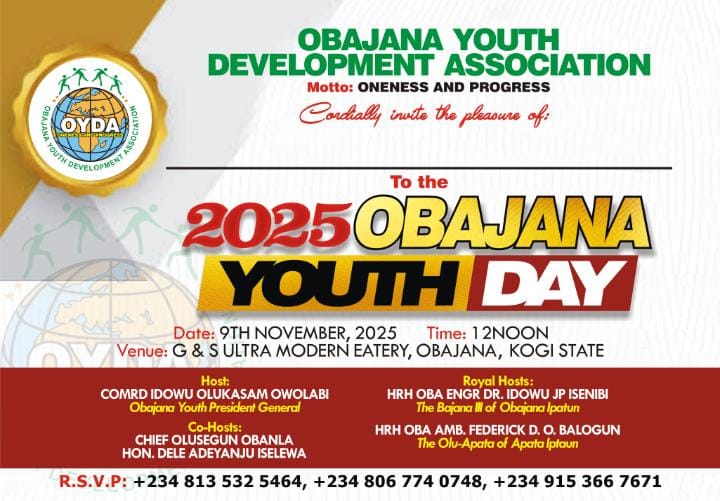According to a statement by the President General of Obajana Youth Development Association, Comrade Idowu Olukasam Owolabi the annual event will take place on Sunday 9th November 2025 at 12 noon.