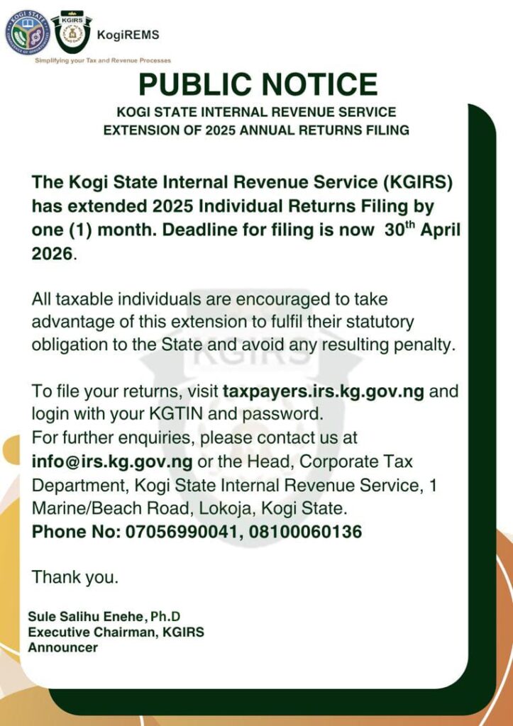 The Kogi State Internal Revenue Service (KGIRS) has announced a one-month extension for the filing of 2025 Individual Annual Returns, shifting the deadline to April 30, 2026.