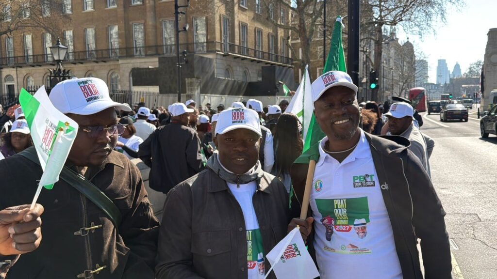 Hundreds of members of a grassroots mobilization movement, PBAT Door 2 Door Movement 2027, UK & Ireland chapter, on Thursday, joined other Nigerians to stage a solidarity rally on the streets of London to celebrate President Bola Ahmed Tinubu’s state visit to the United Kingdom.