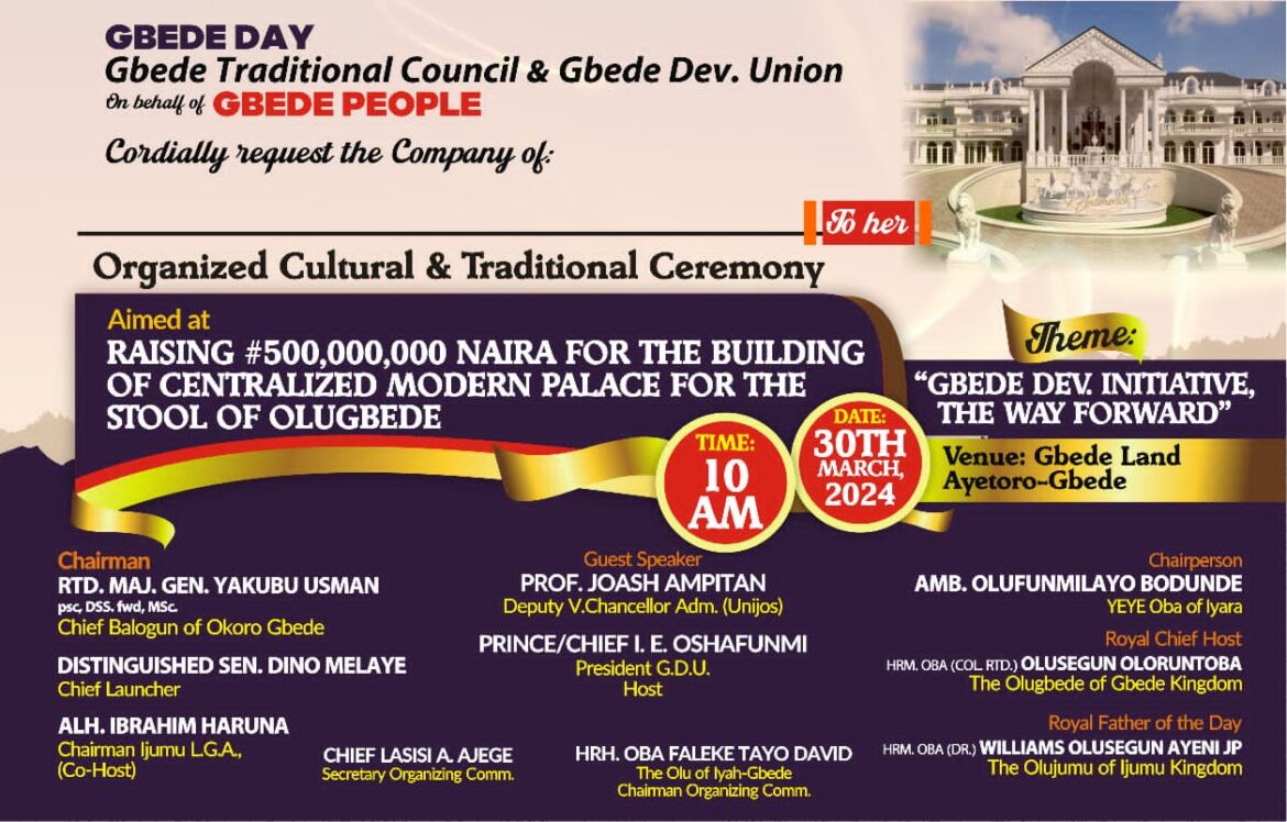 The maiden Gbede Day, the celebration of the rich cultural heritage of Gbede people in Ijumu Local Government Area of Kogi State has continued to gather momentum as dignitaries have agreed to grace the occasion.